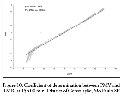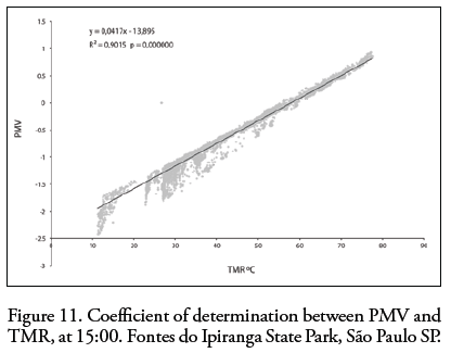 At Consolação district the coefficient of determination was 0.98 and at the Park was 0.90, indicating that more than 90% of PMV can be explained by TMR showing that the correlation is statistically significant (p < 0.05).