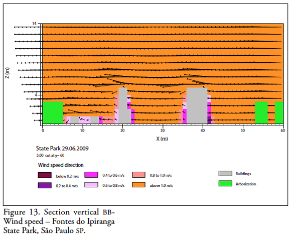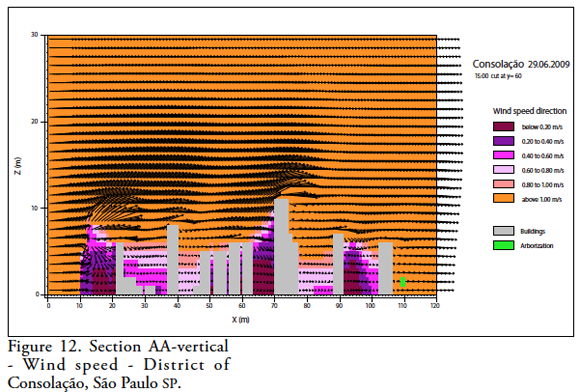 The wind speed within the urban boundary layer is small compared to rural areas, due to surface roughness. Often the so called 'urban canyons', characterized by the ratio of building height/width of streets, are favorable, since they intensify the wind speed favoring the comfort and dispersion of pollutants. The average height of buildings along the streets and blocks studied was around 40 m, so the ratio of height to width remained about 4, which does not cause a large concentration of flow. When comparing the wind speed near the surface, intense winds are observed over the Parque Estadual compared to Consolação (Figure 14). In two cases this process can be reversed: when the wind suffers deflection and forms a jet along the street or when regional winds are calm (presence of anticyclones), which does not apply to the studied areas.