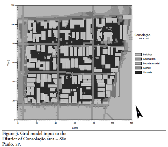 Figure 3 refers to the grid input model for the Consolação region. The resolution of the grid is: x = 4.5 m, y = 4.5 m and Z = 6.0 m and was generated within the model itself. The edge of the model (boundary conditions) shown in Figure 3 (yellow) should not be analyzed because the model does not perform the calculations in this region.