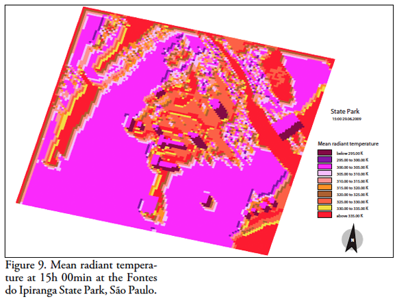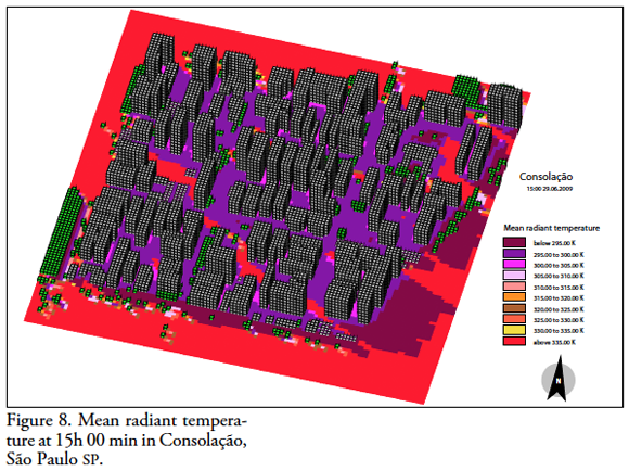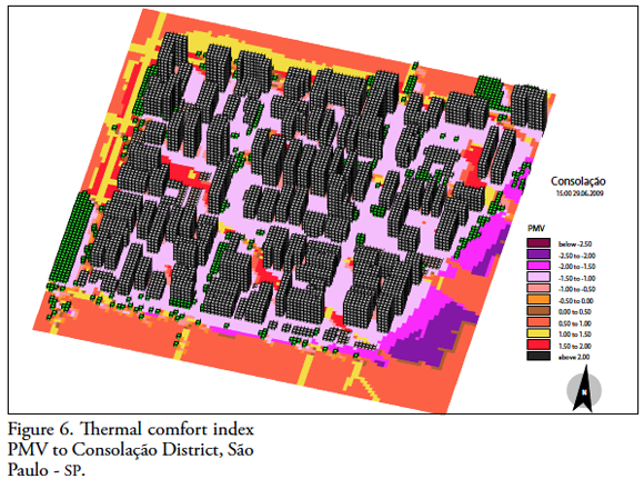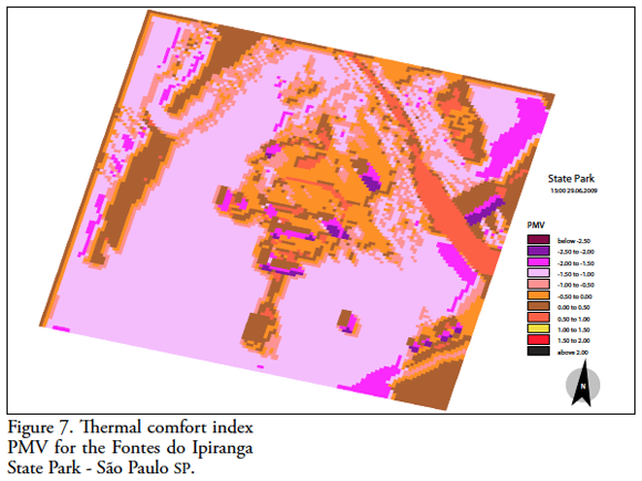 En este estudio se analizó la comodidad termal en distintas áreas en la ciudad de São Paulo. Dos áreas diferentes fueron seleccionadas, densamente construido (Consolação) y el otro fue en el Parque de Estado de Ipiranga (FISP), un área con solo unos edificios e impermeabilidad reducida. Un microclimático ENVI - encontrado fue usado para simular la atmósfera superficial de interacción en el ambiente urbano. La resolución del modelo está entre 0.5 y 10 m. Este modelo fue desarrollado por Bruse y Fleer (1998) y Bruse (2004). Por el índice de comodidad termal PMV (voto medio predicho) y TMR (significan la temperatura radiante) proporcionado por el modelo, esto reveló que el Parque Estatal muestra valores de PMV cerca de cómodo comparado con la otra área estudiada. El análisis del índice de comodidad termal y el flujo de viento mostró la influencia de edificios altos en el ambiente climático local.