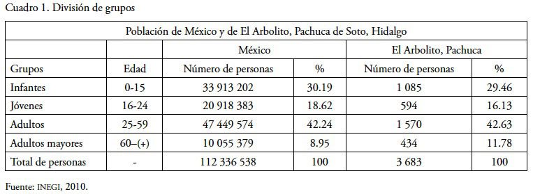 Utilizando los datos del INEGI se decidió dividir a los grupos de siguiente manera: jóvenes de los 16 a los 24 años, y adultos que cuentan con 25 años o más. Esta división de grupos de población se fue amoldando a características generacionales de los arboliteños como son los gustos, las formas de apropiarse de su espacio y la manera de imaginarlo. Se decidió dejar de lado a los infantes porque es un grupo cuya identidad está en formación y poco puede ayudar a los propósitos de este artículo. La conformación de estos dos grupos se hizo con base en los criterios que habitualmente emplea INEGI para dividir por edades a la población, en este caso fue de mayor utilidad manejar de manera conjunta a todos los jóvenes hasta los 24 años pues se ha marcado ahí un corte que diferencia a esta nueva generación con aquélla que construyó físicamente el barrio y sus equipamientos.