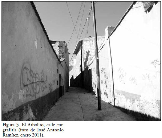 El grafiti es una forma juvenil de marcar el espacio, de apropiarse de él en los términos que expone Claval (1999). Es una manifestación de ocupación espacial y de marcado de territorio. Estas pinturas que se colocan en las bardas de las casas en general se pintan con aerosol (Figura 3). A menudo son ejecuciones sencillas: nombres de pila estilizados, iniciales de alguien o de algo. Otras veces son producto de una habilidad mayor y de una expresividad con más contenido cuyos significados por ahora no se ha podido descifrar. Una de las maneras en la que estos grafitis son percibidos por el grupo adulto, queda sintetizada en la conversación que se tuvo con uno de nuestros informantes: para él, esta manera de "apropiarse del barrio" inspira desconfianza. Hay "gente peligrosa porque se quieren hacer respetar: imponerse". Y agrega: "Son personas que desagradan pero no significa que es un barrio totalmente peligroso" (Rogelio Olivier, entrevistado: 28 de mayo de 2011). Esto último es revelador de la ambigüedad que priva. Otros entrevistados jóvenes muestran el mismo sentir al hablar de su propio grupo de edad: "Algunos son buena onda, algunos son ayudadores. Algunos son trabajadores igual" (Edgar Rivera Monroy, entrevistado: 28 de mayo de 2011). Violencia y solidaridad parecen ser parte de la experiencia vivida que define los extremos de su identidad (Figura 3).
