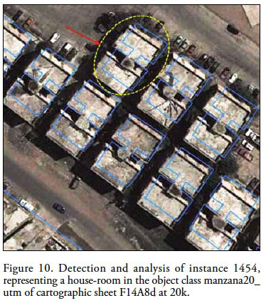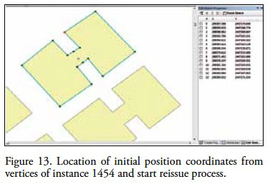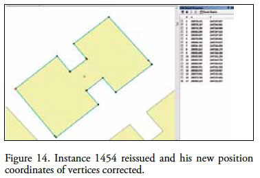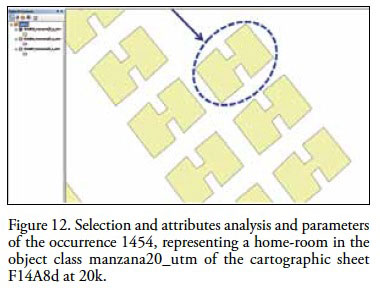 Importantly for the vector analysis representing the homeroom in the current geometry of cartographic sheet F14A8d at 1:20 000 scale, we would enter an exhaustive quality evaluation process. So to reissue the current geometric conformation of the objects that were indicated, the aim should be well determined, since there would be too many objects to reedit and the process would be long. To support this analysis methodology, we focus on showing the object in single editing, which exemplifies the processes to follow if you wish to reedit large amounts of objects. This methodology, supports current research in the interactive approach or amplified intelligence (Sabo, 2007), which uses commercial systems for interactive generalization; due to the difficulty of using fully automated solutions. The object has been selected, corresponds to a reality geometric representation through the vectors conformation. This randomly chosen object, described his position from UTM coordinates (Figure 13), which were analyzed with respect to image coordinates, used as a basis for the study area.