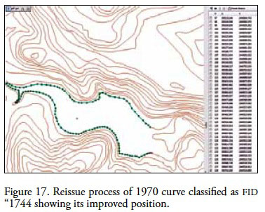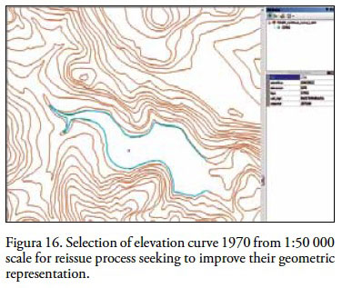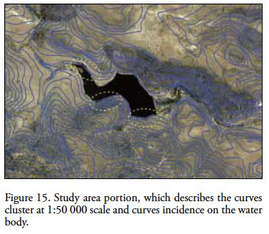 We applied various editing procedures to different map sheets of the study area and to extend evaluation expectations, was also used F14a84 map sheet, corresponding to continuous curves 1:50 000 scale. Since curves are made up of a polylines seriation, we were interested on knowing its current geometric constitution with respect to the territory covered representation in the study area. The curves on the indicated scale, were built in a series of photogrammetric restitution stages, with different technologies and diverse staff, vary in representation, which also lacks of an exhaustive evaluation process of their vectorial quality. Showing different quality aspects, we concentrated on the curves near to a water body, where they fall within that body (Figure 15). The initial intention is to analyze why this happens and to find a way to correct it, using the same reissue methodology from polyline current state and drawing nodes concatenation. The process to follow involved the occurrence attributes description and detecting current nodes vertices and their position coordinates.