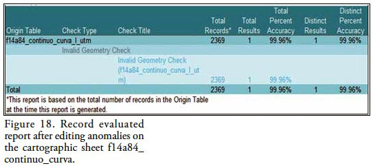 Once the reissue process is completed, it is necessary to activate the evaluation parameters on the map sheet in analysis, to verify the anomalies existence on the continuous curves integration within the cartographic sheet. Next, Figure 18 describes an example report showing derived accuracy percentage from the evaluation process made with the parameter Invalid geometry Check.