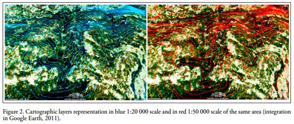 In most cases, information integration from vectorial samples at different scales analyzed show in high percentage the same problematic in the indicated correspondences. Sometimes the semantic representation evidences changes, due to data sets produced temporality, by facts that scale production 1:50 000 was edited between 1968 and 1988 being integrated at 1:20 000 scales which has been edited recently. Such processes will be able to be detailed later. The integration purpose of data sets mentioned above was performed to analyze the geometric relationships, topological, semantic and positional accuracy between different information scales on the same territory. Since the 1:50 000 cartography has been essentially used in the country over the past 40 years, and having begun the editing mapping process to 1:20 000, we were interested in knowing the correspondences between the two information databases. For example, it should be common that the contours representation 1:50 000, that goes to each 10 meters, regarding the contours at 1:20 000 which also are set to the same equidistance, these should match respectively in geometry terms and positional accuracy. However, since in the editing process the cartography at 1:50 000 emerges from a photography scale to 1:75 000 and the 1:20 000 cartography emerges from a photography scale to 1:40 000. Such situation affects perhaps the resolution of both photographic scales and also considering the following circumstances, which have to do with alternative editing processes have been used over time, technological advances, the different staff working in the editing process and the application of different regulations over time. To demonstrate these differences to resort migrate vectorial files in .shp format of cartographic sheets (f14a84_50k and f14a84d_20k) on both scales indicated in GE platform, according with procedures to be detailed further ahead. Such representations are outlined in Figures 2 and 3. According to geometric representation analysis, it is possible to describe vectorial cartography that best represents the orographic characteristics in GE images is the scale 1:20 000, equally it is possible to be verified that the editing processes have been of better quality than the processes carried out with the curves on scale 1:50 000. Since this vectorial cartography constitution is recent and in which have been used new editing technologies, it is natural that this happens; nevertheless, it does not have to be omitted that in the analysis process of both vectorial coverage, exist editing anomalies, that even imply important lack in the information representation on selected samples of the territory to be analyzed.