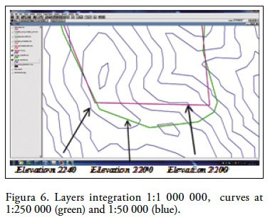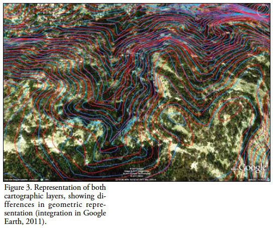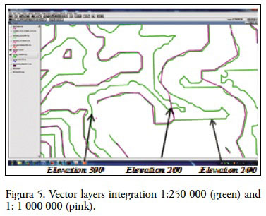 By verifying the same curves corresponding at different scales, the geometric representation has to be similar; nevertheless, it differs greatly in the logic representation territory. Similarly, if you compare it with a background image, it can be seen that such inconsistencies are represented in the study area. The scales 1:250 000 and 1:1 000 000 have reportedly been subjected to cartographic generalization processes of manual type, due to lack of technology and perhaps to the little given importance of the quality issue adjudicated from these scales that should represent the territory.