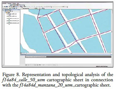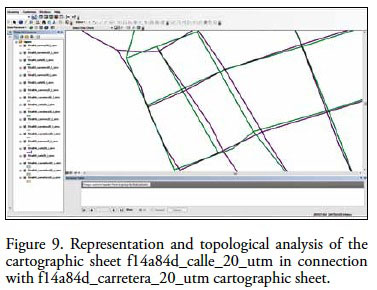 About, the cartographic layer description in purple, corresponding to cartographic sheet f14a84_calle_50_utm, describes a field representation that differs from the map layer representation in blue which describes geometry corresponding to f14a84d_manzana_20_utm cartographic sheet, where it displays a problem in topological order between the information in both scales. Continuing with the analysis, another data set was added to the maps sheet f14a84d_calle_20_utm (purple) and f14a84d_carretera_20_utm (green), (Figure 9).