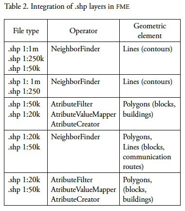Once cartography was analyzed and referenced in the used technologies, we proceeded with some cuts analysis made in ArcGIS, which in turn served as elements, and file forms, they would be integrated into a FME Workbench platform. Subsequently, a platform operator series were used to start with layer integration from required information. This subsequently classified the following information layers that were integrated and their respective scales (Table 2).