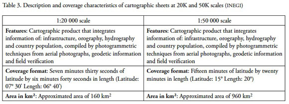To start with the analysis stages, at first it was important to become familiar with the vectorial cartographic databases from Mexico, as well as to obtain a used data description and how these would be analyzed. Used methodology consisted, in making a conceptual model of the analysis problem with UML (Unified Modeling Language), making a review of the country's cartography current state and familiarize with vectorial cartographic databases at different production scales (1:20K; 1:50K; 1:250K and 1:1,000K). The technologies that served these experimentations are FME Workbench, ArcGIS, DataViewer and Google Earth (GE). The data used to carry out such experimentations were officially requested to the National Institute of Stadistics and Geography (INEGI). To proceed to direct data representation in the study particular area, these were checked and at time were adapted to the technologies operators used. The following Table 1 it describes in detail the reference basis from coordinate systems used in analyzed cartographic scales.