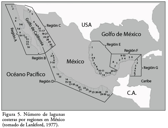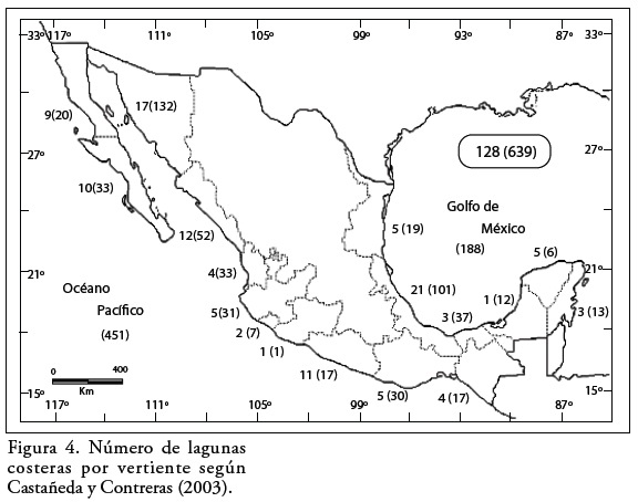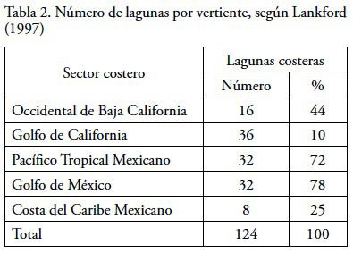 Los casos extremos entre el número de cuerpos de agua costeros están entre Lankford (1977) quien señaló aproximadamente 125 lagunas, y Castañeda y Contreras (2003) quienes determinaron más de 600; estos últimos autores consideraron como unidades individuales aquellos cuerpos que se encuentran en un mismo sistema costero, pero que se han fragmentado por su propia evolución sedimentológica y actividades antrópicas. Por su parte Ortiz y de la Lanza (2006) clasifican por regiones a la zona costera de México de acuerdo con la red fluvial y su intercambio energético, con el arreglo fisiográfico, con su geología, con el clima y con la vegetación de ambas márgenes (Pacífico y Golfo de México), obteniendo un total de 164 lagunas.