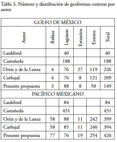 Para la margen del Pacífico Castañeda y Contreras (2003) refieren 451 lagunas, Lankford (1977) contabilizó 84, Carbajal (2003) calculó 394 y en este trabajo, sumando todos los rasgos geomorfológicos, se calcularon 426 sistemas. En lo que respecta a la margen del Golfo de México, Castañeda y Contreras determinaron 188 lagunas, Lankford 40, Carbajal 209, y en estudio fueron 149, incluyendo lagunas, estuarios, esteros y bahías. Para todo el país la suma total según Castañeda y Contreras es de 639 lagunas (Figura 4), Lankford 124 (Figura 5), Carbajal cuantificó 603 y en este trabajo 575. Cabe insistir que lo estimado en este estudio es el resultado de la integración de la información de los autores citados, además de Ortiz y de la Lanza (2006) y de la página del INEGI, con su correspondiente análisis diferencial, bajo el criterio personal de los que suscriben. En la Tabla 3 se desglosa en forma aproximada la distribución de las geoformas por tipo.