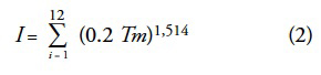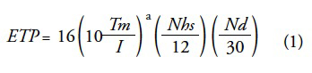 Em que, ETP é a evapotranspiração potencialmensal; Tm é a temperatura média mensal adquiridado banco de dados do Laboratório de Meteorologiade Pernambuco (LAMEPE) correspondentesaos anos dos dados pluviométricos, é a média de horas por dia com insolação, Nd é o número dedias no mês, e I e a foram obtidos pelas equações 2 e 3, respectivamente.