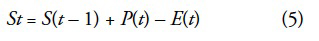 Em que, St é o armazenamento de água no solo; S(t 1) é o armazenamento de água no solo nomês anterior, P(t) é a precipitação pluvio métrica média mensal e E(t) representa a evapotranspiraçãopotencial mensal.