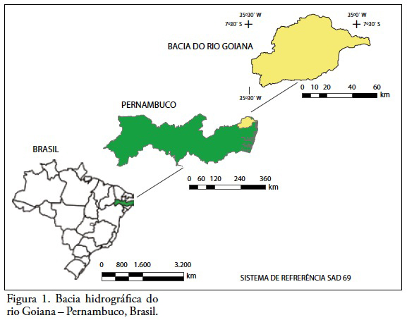 A bacia hidrográfica do rio Goiana está localizadaentre as coordenadas de 07º 22' 20" e 07º 54' 47" latitude sul e 34º 49' 06" e 35º 41' 43" longitudeoeste no Estado de Pernambuco, Brasil (Figura 1). Possui uma área de 2.847,53 km2 abrangendo 26 municípios da Região da Zona da Mata Norte pernambucana.Abastece com suas águas o consumodoméstico, industrial e agrícola da maioria destesterritórios municipais.