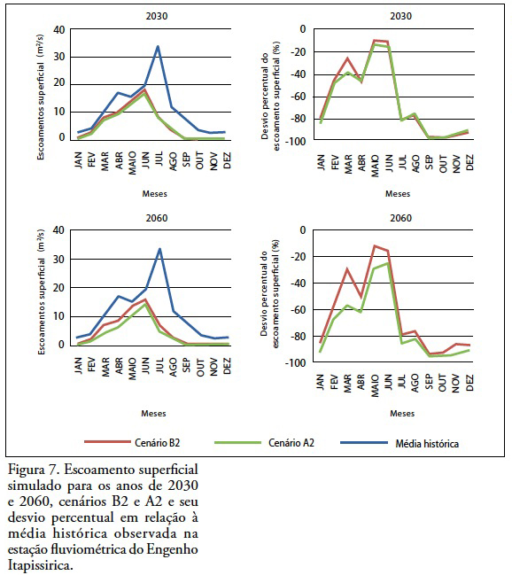 Para estação fluviométrica do Engenho Itapissirica (Figura 6) é possível notar que a projeção para omês de julho, em ambos os cenários de mudançasclimáticas, apresenta as maiores reduções no escoamentosuperficial. Problema semelhante foiencontrado para o referido mês na estação fluviométricado Engenho Retiro devido a problemas nomodelo hidrológico, o qual subestima o escoamentoem períodos de picos pluviométricos.