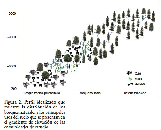 En el área prevalece el clima cálido húmedo con lluvias en verano. El gradiente altitudinal va de 200 a 3 000 msnm (INEGI, 1980), con diferencia de elevación dentro de las comunidades de al menos 1 000 m. En las partes bajas prevalecen selvas altas perennifolias y encinares tropicales, seguidos de bosques mesófilos y en las partes más altas se encuentran bosques de pino-encino y encinares templados (van der Wal, 1999; Rincón, 2007; Figura 2). También se practica la agricultura de roza-tumba-quema para producir maíz, y entre las principales fuentes de ingreso local está la producción de café y la cría de ganado (De Teresa, 2011).