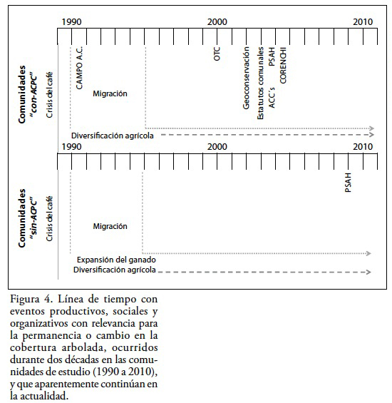 La información social confirmó la pertinencia de la segregación de las comunidades respecto a su acción colectiva, pero también ayudó a reconocer otros factores (incentivos, presencia de actores externos, ganadería y fluctuaciones poblacionales) que pudieron haber influido en la permanencia o conversión de áreas con cobertura arbolada. Entre 1990-2000, todas las comunidades experimentaron severos efectos económicos por la "crisis" en los precios del café (Hite, 2011), migración y cambios en los sistemas productivos (Romero, 2009). Actualmente, en todas las comunidades aún se cultiva café, pero sin la intensidad con que se hacía hasta 1990, y este producto ya no es la única fuente de ingreso (Nieratka, 2011). Gran parte del café producido en las comunidades con-ACP es orgánico, y en menor cantidad producen café "convencional", y su venta se hace a través de organizaciones cafetaleras o individualmente a intermediarios. En las comunidades sin-ACPC, Sochiapam es el principal productor y concentrador de café, y básicamente producen café "convencional".