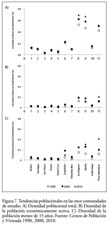 La recurrente revegetación de zonas agropecuarias se ha relacionado con el abandono de cultivos por migración (Bonilla et al., 2012; López, et al., 2002; Robson y Berkes, 2011). La densidad de población total en ocho de las once comunidades de estudio casi no cambió entre 1990 y 2010, lo cual coincide con lo reportado en otras comunidades de la misma etnia (Romero, 2009; Robson y Berkes, 2011), donde está mejor documentado el fenómeno de la migración. La migración, es un fenómeno histórico en La Chinantla (Bevan, 1987), pero sigue vigente debido a la marginación de las comunidades (Berumen, 2007; De Teresa, 2011). Sin embargo, aunque establecer esta relación no fue el propósito de este estudio, se encontró que las comunidades con valores más bajos de densidad poblacional entre 1990-2010, fueron aquéllas que presentaron mayor porcentaje de permanencia de cobertura arbolada (≥ 90%; Tabla 2, Figura 7a). En el resto de comunidades (Sochiapam, Zautla y Tlacoatzintepec), hubo menor permanencia arbolada y la población aumentó entre 1990 y 2010, y particularmente en Tlacoatzintepec se registró el mayor incremento en población joven.