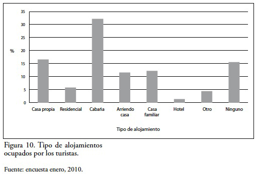 El gráfico muestra que el 32% de los visitantes se hospeda en cabañas, el 17% en casa propia, un 12% arrienda una casa y otro 12% se hospeda en casa de familiares. Las categorías de hoteles y residenciales suman tan solo un 7% en las opciones de alojamiento a las que recurren los turistas de El Quisco. Claramente, las alternativas de alojamiento que se ocupan son las más económicas, lo que limita el desarrollo de una oferta hotelera de calidad en el balneario (Figura 10).