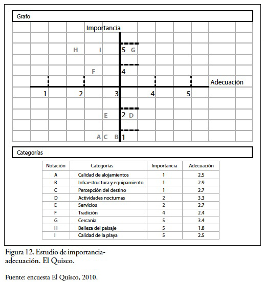 El estudio de importancia adecuación consiste en la comparación entre la importancia que los turistas asignan a los atributos consultados y a la adecuación que perciben de esos atributos (para su satisfacción) en el destino turístico. Estas calificaciones se grafican en dos ejes que forman cuatro cuadrantes, cada eje está graduado con una escala cualitativa; la escala de importancia se dibuja en forma vertical y la escala de adecuación se dibuja en forma horizontal cortándose en el punto medio de calificaciones. Por lo tanto, si una persona asigna una alta importancia a un atributo y un alto nivel de adecuación, su calificación será dibujada en el cuadrante superior derecho y significará que el atributo del destino cumple con las expectativas del visitante. Así, si la calificación queda dibujada en el cuadrante superior izquierdo significará que el visitante asigna un alto nivel de importancia al atributo, pero que el lugar no se encuentra adecuado a su expectativa en ese destino.