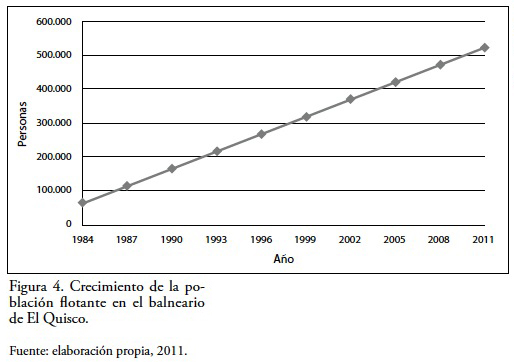 Así, la demanda turística de El Quisco muestra un crecimiento explosivo en las últimas décadas alcanzando una tasa anual de 116%; de esta manera el balneario se ha convertido en un importante destino para los ocho millones de turistas internos, que viajan cada verano a lo largo del país (Diario El Mercurio, 2013; Figura 4).