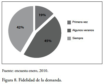 Respecto de la fidelidad, el porcentaje de turistas que visitan el balneario "siempre" es superior a un tercio del total de visitantes, pero éste es superado por los visitantes que alternan este balneario con otros destinos. El porcentaje de fidelidad absoluta deberá disminuir en la medida que aumente la capacidad de gasto de los visitantes, lo que les permite elegir otros destinos turísticos (Figura 8).