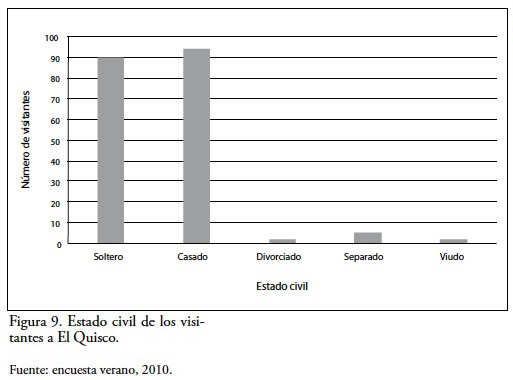 En relación con el estado civil de los visitantes, del total de turistas encuestados, un 46% eran casados, mientras que un 44% solteros, siendo los porcentajes de separados, divorciados y viudos inferior al 5%. Esto confirma que el balneario se asocia a grupos familiares y grupos de amigos (Figura 9).