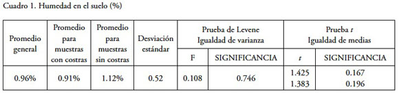 Como se evidencia, la prueba de Levene para el porcentaje de humedad del suelo, resultó no significativa, por lo cual se asume la igualdad de las varianzas entre los grupos muestrales, y se tomó el primer valor de t, reportado en la fila superior del estadístico, el cual arrojó una significancia superior a 0.05, lo que permite asumir la igualdad de las medias en ambos grupos muestrales y afirmar que no existen diferencias significativas entre éstos, por lo que se acepta la no incidencia de la costra microbiótica en esta propiedad del suelo.