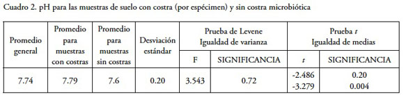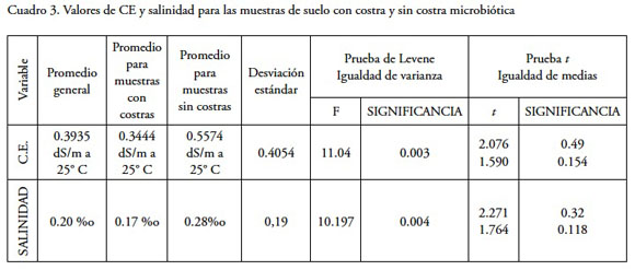 Al comparar los valores de CE media obtenidos de acuerdo con la cobertura, se tiene que ambos grupos muestrales clasifican como no salinos, por lo que para ambas variables no se evidencian diferencias significativas (significancia en la prueba t > 0.05) a partir de la presencia de la costra microbiótica en la superficie del suelo (Cuadro 3).