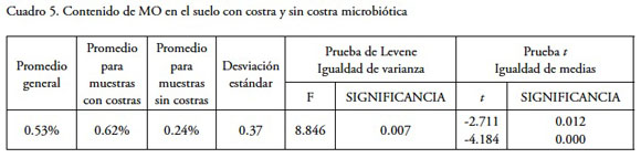 El análisis de materia orgánica efectuado a las muestras de suelo, permite afirmar que la superficie del suelo que no presenta costra microbiótica si muestra niveles de materia orgánica muy bajos (promedio MO = 0,24%), mientras que las muestras con costras presentan un incremento de más del 100%, ya que alcanza niveles promedios bajos (0.62%), (Cuadro 5).