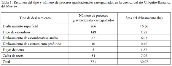 Este estudio desarrolla un inventario histórico de procesos gravitacionales con base en dos series de fotografías aéreas digitales y trabajo de campo. Los procesos de remoción en masa fueron digitalizados en el SIG, y una base de datos geoespacial se desarrolló para una mejor descripción. El trabajo de campo y la fotointerpretación permitieron la representación cartográfica de 571 procesos gravitacionales. La definición y cartografía geomorfológica se realizó por varios medios, como la morfometría, el conocimiento heurístico del área en estudio y sus procesos, la verificación y validación con trabajo de campo (Dikau et al., 1995; Evans, 2012) y utilizando y adaptando el protocolo de zonificación del peligro de procesos gravitacionales del Departamento de Recursos Naturales (DNR), División de Prácticas Forestales del Estado de Washington, (Washington State Department of Natural Resources (DNR), Forest Practices Division, 2006). Este análisis divide la cuenca en doce formas del relieve originadas por remoción en masa, a las cuales se les asignaron índices de peligrosidad y de estabilidad de bajo a muy alto. En la cartografía se incluyen unidades o formas reguladas del relieve (FRR) definidas como de alto riesgo de producir deslizamientos e incluyen: barrancos, cabeceras (también llamados depresiones de lechos rocosos, rellenamientos de coluvión o simplemente depresiones), cabeceras convergentes, deslizamientos de asentamiento profundo activos, flujos de tierra y meandros. Otras formas del relieve que fueron cartografiadas, llamadas formas no reguladas del relieve (FNRR) incluyen: barrancos, cabeceras, cabeceras convergentes, planicies, laderas con gradiente bajo, moderado y alto.