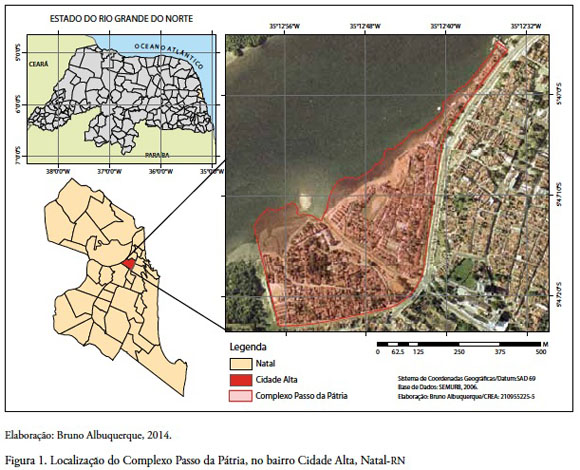 A área de estudo, o Complexo Passo da Pátria, situa-se no bairro Cidade Alta, zona leste da cidade de Natal. Segundo a Lei Municipal Complementar nº 44 de 2002, que dispõe sobre o uso do solo, limites e prescrições urbanísticas para área Especial de Interesse Social (AEIS), o Passo da Pátria é denominado como tal. O Complexo tem uma área total de 205 506 m2 e limitase ao Norte, com a margem direita do rio Potengi; ao Sul, com a linha férrea; ao Leste, com a Pedra do Rosário e, a Oeste, com a Base Naval Almirante Ary Parreira. Na Figura 1 abaixo é possível visualizar a localização do Complexo Passo da Pátria dentro da cidade de Natal-RN.