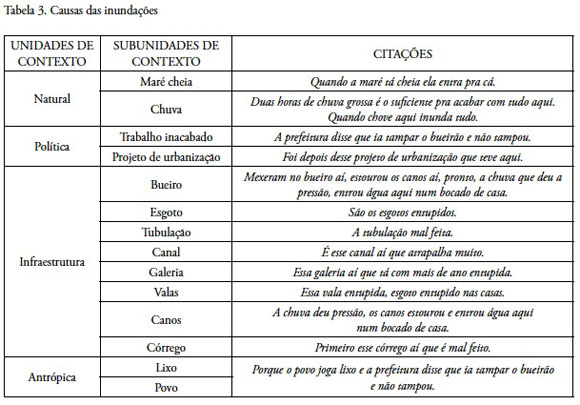 Outro questionamento relaciona-se às causas das inundações na localidade de estudo apontadas pelos entrevistados. Identificaram-se quatro unidades de contexto, a saber: naturais, políticas, infraestruturais e antrópicas, de acordo com a Tabela 3 abaixo: