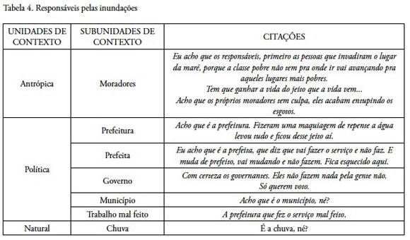 Além disso, perguntou-se aos entrevistados a quem eles atribuíam a responsabilidade pelos eventos de inundações. Foram identificadas três unidades de contexto, de ordem antrópica, política e natural, de acordo com a Tabela 4.