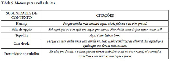Outro assunto abordado foi sobre os motivos de escolha que levaram aos entrevistados optar por viver no Complexo Passo da Pátria. Sobre isso se tem a Tabela 5 a seguir.