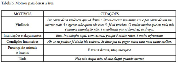 Um dos motivos citados, a violência é um fato que se observa em Natal, com maior ênfase, especialmente, nas áreas mais pobres da cidade. Como afirma Jacobi (2006), as áreas periféricas agregam inúmeras situações de risco, inclusive a problemática da violência relacionada à homicídios, tráfico de drogas, policiamento insuficiente e alta concentração de população de baixa renda. Essa problemática também é observada em outras capitais brasileiras a exemplo do estudo de Souza e Zanella (2009) na capital do estado do Ceará que apontou para resultados similares. Nessa problemática, segundo os entrevistados estão a ocorrência de uso de drogas, principalmente por jovens e adolescentes, além de roubos, furtos e homicídios na comunidade. Em seguida, apontaram-se os problemas relacionados às inundações e alagamentos que ocorrem frequentemente no local. Outro motivo seria a oportunidade de terem um lugar melhor para se viver o que na maioria dos casos não é possível devido às condições financeiras da população da comunidade. Além disso, a presença de ratos, baratas, mosquitos e outros vetores de doenças seria o motivo que os levaria a mudar do local. Tem-se, ainda os moradores que afirmaram que nada os faria mudar da comunidade, apesar de todos os problemas presentes na área. De acordo com Firey (2006) citado por Marandola Jr e Hogan (2009) em situações como essa não somente os aspectos racionais devem ser considerados como também os simbolismos e identidades construídas em torno dos lugares, que mesmo apresentando características de degradação social, econômica ou ambiental, mantém sua capacidade aglutinadora e atratora para a população.