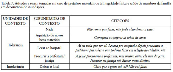 Os entrevistados foram, ainda, questionados sobre que atitudes seriam adotadas por eles caso ocorresse alguma inundação que trouxesse prejuízos materiais ou prejuízos à integridade física de algum morador de sua residência. Identificou-se, portanto, dois grupos de unidades de contexto, como as atitudes tolerantes e atitudes intolerantes, como se pode observar na Tabela 7 abaixo.