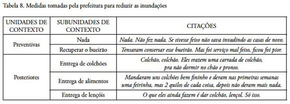 Perguntouse, ainda sobre as ações realizadas por parte da prefeitura para reduzir os riscos de inundações na comunidade. Conforme mostra a Tabela 8 abaixo foram identificadas como unidades de contexto as medidas de caráter preventivas e posteriores aos eventos de inundações.