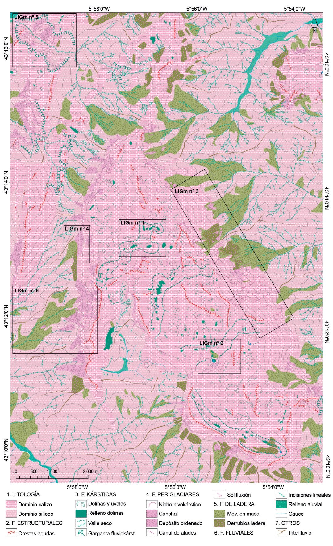 Para cada uno de los LIGm se ha realizado una ficha descriptiva que recoge los aspectos esenciales desde el punto de vista de sus valores geomorfológicos y los relacionados con su posible uso y gestión (véase Beato, 2018). Los LIGm nº 1 y 2 son un lugar representativo y un elemento singular en los que se puede analizar la evolución geomorfológica de los afloramientos calizos elevados. En la plataforma culminante de la Sierra del Aramo por encima de los 1400 m han quedado colgados varios niveles fluviales correspondientes a redes de drenaje antiguas, así como formas asociadas a procesos bajo diferentes ambientes morfoclimáticos. Tanto en el entorno del Angliru como del Gamoniteiro se pueden observar fracturas, escarpes de falla, valles muertos, uvalas, campos de dolinas, rellenos alóctonos, rellenos ferruginosos, conos rocosos, superficies regularizadas, variadas formas de lapiaz, canchales, dolinas nivales, entrada de simas y galerías, abrigos. No obstante, el LIGm nº 2 es un elemento singular, pues contiene, además, un nicho nivokárstico en forma de anfiteatro de grandes dimensiones con un alto interés científico y pedagógico.