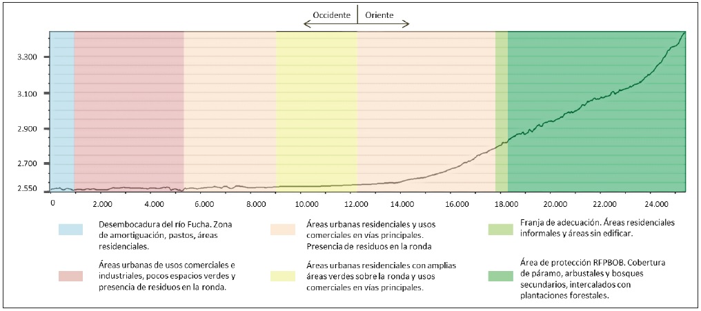 Durante los recorridos en campo por la ronda del río Fucha se observó que uno de los usos principales es el residencial. En la parte media de la microcuenca, entre las localidades de Puente Aranda y Antonio Nariño, se encuentran amplias áreas verdes en la ronda del río con parques que poseen infraestructura para la recreación, a diferencia de la parte baja de la cuenca, donde en la ronda se encuentran construcciones muy cercanas al cauce, pocos espacios verdes y presencia de residuos sólidos, zona también relacionada al sector industrial y de comercio. En la parte media-alta de la microcuenca de la zona urbana se encuentran algunos asentamientos de habitantes de calle, rondas nuevamente más reducidas y barrios de autoconstrucción con edificaciones más dispersas a medida que se asciende, donde hay cambio de la cobertura vegetal nativa por pastos. En la cuenca alta, área que corresponde a la RFPBOB, se encuentra cobertura vegetal de arbustales, bosque secundario y páramo, intercalada con parches de plantaciones de eucaliptos y algunas acacias en el borde de la reserva, así como plantaciones de pinos en la parte más alta (pino patula, principalmente, y pino ciprés) (Figura 4).