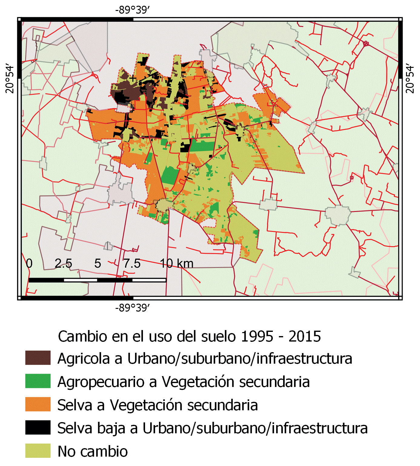 La pérdida de selva y vegetación secundaria arbórea se aprecia en tres circunstancias distintas. El primer caso se refiere a 485.6 hectáreas de parcelas agrícolas en 1995 que cambiaron su uso a áreas habitacionales de vivienda rural o urbana, o bien infraestructura para granjas, bodegas, edificaciones, que se encuentran principalmente al Norte de la Reserva que es la zona más cercana al periférico y la ciudad de Mérida. El segundo cambio relevante se refiere a 3212.23 hectáreas de fragmentos de selva en 1995 que fueron deforestados o perturbados y cambiados a uso agrícola o pecuario o se encuentran en una fase reciente de recuperación como vegetación secundaria herbácea o arbustiva. Estos predios se ubican principalmente al centro, Norte y en el límite Oeste de la Reserva (Figura 5).