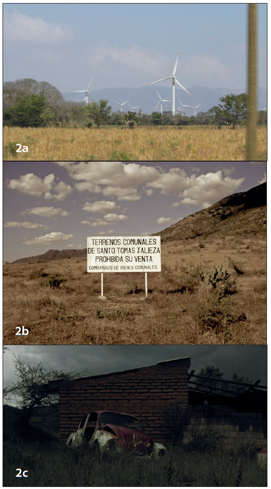 No hay en la propuesta del geógrafo español una intención por relegar o negar el poder de la imagen como tal, sino un interés por atender cómo y qué se ve del paisaje en tanto imagen. En el caso de Aragón, la cámara como medio y tecnología le permiten captar lo externo del paisaje, lo que le es propio por sus formas naturales, al tiempo que muestra diferentes (o posibles) visiones que se tienen de él.3 ¿Pero cómo lo hace? Lejos de metáforas o alegorías, sus videos contrastan el paisaje natural con el paisaje social y de la memoria: mientras se ven montañas bañadas por los colores violáceos del cielo como efecto de la puesta del sol, llanuras de un verde brillante con el detalle de un pequeño pozo de agua, el azul verdoso de las lagunas, o la aparente línea que divide al cielo del mar, se contraponen vistas de carretera, terrenos baldíos con automóviles viejos, pequeñas chozas azotadas por los efectos de los huracanes o plantas de electricidad con turbinas eólicas al sur de México, que son explotadas para comerciar energía con países del norte mientras las comunidades cercanas carecen de electricidad (Figura 2).