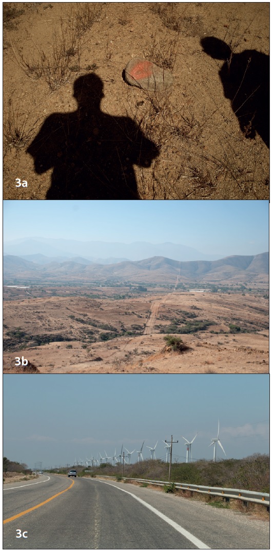 Figura 3 Conocer y explorar el paisaje. 3a) Edgardo Aragón y su equipo durante su recorrido de investigación en las zonas aledañas al municipio de Ocotlán de Juárez, Oaxaca, como parte de la producción de la pieza Tinieblas (2009). Cortesía del artista. 3b) Imagen de documentación como parte de la producción de la pieza Tinieblas (2009). Cortesía del artista. 3c) Fotograma del video Mesoamérica: el efecto huracán (2015), que muestra el viaje por carretera de Ocotlán al poblado de Cachimbo en Oaxaca.