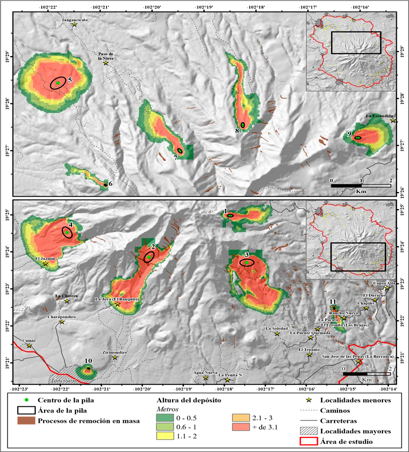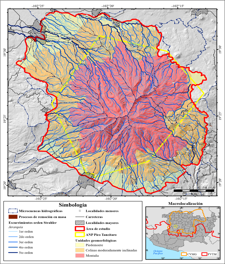 Al suroeste del Campo Volcánico Michoacán-Guanajuato se localiza el Pico del Tancítaro, el cual es un estratovolcán que comenzó su actividad a finales del Pleistoceno inferior y se considera extinto. Este volcán sufrió dos grandes avalanchas de escombros hace más de 200 000 años, disparadas por actividad tectónica y magmática. En la actualidad continúa presentando pequeños deslizamientos y flujos de lodo, generalmente desencadenados por lluvias intensas en las áreas de altas pendientes. Considerando lo anterior, se ha planteado como objetivo de esta investigación identificar y cuantificar el riesgo por PRM en los alrededores del Pico del Tancítaro mediante la determinación de zonas de peligro y el análisis de la vulnerabilidad. Adicionalmente, se analiza la exposición a inundaciones por cercanía a los cauces de ríos, ante los desbordamientos que han ocurrido en tiempos recientes, los cuales han generado desastres en las localidades cercanas.