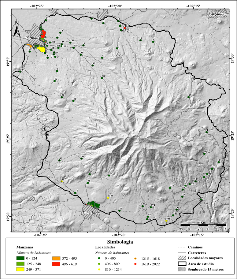 In the third part, the previously mentioned layers were crossed, obtaining five levels of risk, from very low to very high. The risk of landslides is considerable in the southeast of the study area (towns in the municipality of Nuevo Parangaricutiro). The localities with the highest exposure to flooding are Peribán, Zirimondiro, Santa Ana Zirosto, Araparícuaro and Choritiro.
