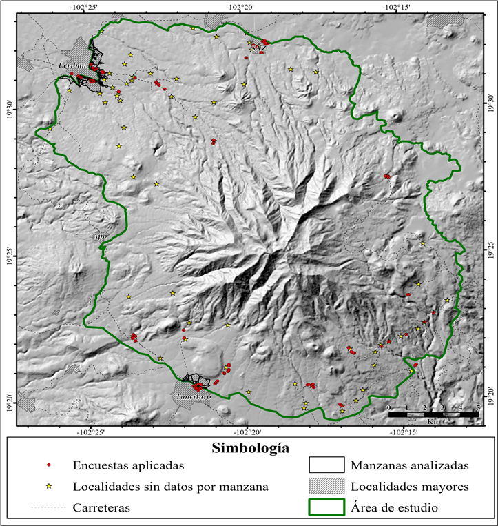 Los peligros geomorfológicos son el conjunto de fenómenos adversos o amenazas a los recursos y vidas humanas, que surgen de la inestabilidad y cambios en las características de la superficie de la Tierra (Gares et al., 1994). En este sentido, la posibilidad de ocurrencia de estos fenómenos se acentúa en terrenos volcánicos, los cuales, su morfología y características litológicas los convierten en el ambiente ideal para una alta manifestación de procesos de remoción en masa (PRM) (McGuire, 1996; Capra y Macías, 2000; Capra et al., 2002; Villeneuve y Heap, 2021). Los movimientos del terreno en ambientes volcánicos están condicionados por la naturaleza de la roca volcánica, que suele estar muy fracturada, en forma granular, rica en arcilla y saturada de agua, debido a que los volcanes tienen sistemas hidrotermales y magmáticos propios, los cuales tienen un fuerte control sobre los movimientos del terreno y las avalanchas de escombros volcánicas (Ui, 1983; Siebert, 1984, 1996; Pola et al., 2012). En consecuencia, los movimientos del terreno en ambientes volcánicos tienden a transformarse en grandes flujos de detritos, con lo cual aumenta la complejidad y afectaciones de estos fenómenos, a diferencia de lo que sucedería en otros ambientes (van Wyk de Vries y Delcamp, 2015). En este tenor, el Pico del Tancítaro (PT) representa un claro ejemplo de la ocurrencia de estos fenómenos, pues sufrió dos grandes avalanchas de escombros, la primera hace 694 a 571 mil años antes del presente (AP) y la segunda hace 261 a 238 mil años AP (Ownby et al., 2007), las cuales determinaron su geomorfología y depósitos circundantes actuales. En tiempos recientes se han presentado pequeños deslizamientos, principalmente en las carreteras (Magaña-González, 2015; Redacción-ME, 2021), y aunque a la fecha no han dejado víctimas fatales, se debe prevenir y gestionar el riesgo en estas zonas. Debido a lo anterior, el objetivo de esta investigación es identificar y cuantificar el riesgo por PRM en los alrededores del Área Natural Protegida del Pico del Tancítaro mediante la determinación de zonas de peligro y el análisis de la vulnerabilidad con ayuda del modelo SAVE (Morales-Manilla, 2010).