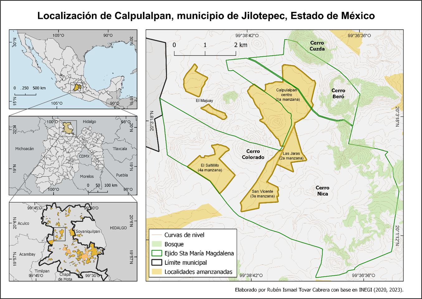 La noción de territorio es de amplio uso en la geografía de hoy. Por un lado, parece ofrecer precisión al momento de utilizarla, y por el otro, brinda cierta versatilidad para designar distintos espacios. Sin embargo, como todos los conceptos geográficos, no parece conveniente aceptar definiciones cerradas ni tampoco utilizarlos con significados que sean demasiado abiertos y que por ello puedan causar confusión. Por tanto, y según el enfoque cultural, nos parece conveniente ubicarlo a una escala local y en casos de estudio específicos. Esto nos permite entender cómo, las y los habitantes de un determinado lugar, construyen el territorio con el que se identifican y se conciben como un grupo con aspiraciones comunes. En este artículo estudiaremos un caso en donde el territorio es construido y reconstruido socialmente mediante ritos que se celebran cada año. Nos referimos a la festividad de los xhitas, que tiene lugar en Calpulalpan, una de las localidades del municipio de Jilotepec, en el Estado de México, representada por una delegación municipal cuya jurisdicción abarca las cuatro manzanas de Calpulalpan: Calpulalpan centro, Las Jaras, San Vicente y El Saltillito. Las tierras que le corresponden se encuentran mayormente inscritas en el ejido de Santa María Magdalena Calpulalpan, cuyas principales autoridades son los comisariados ejidales (Figura 1).