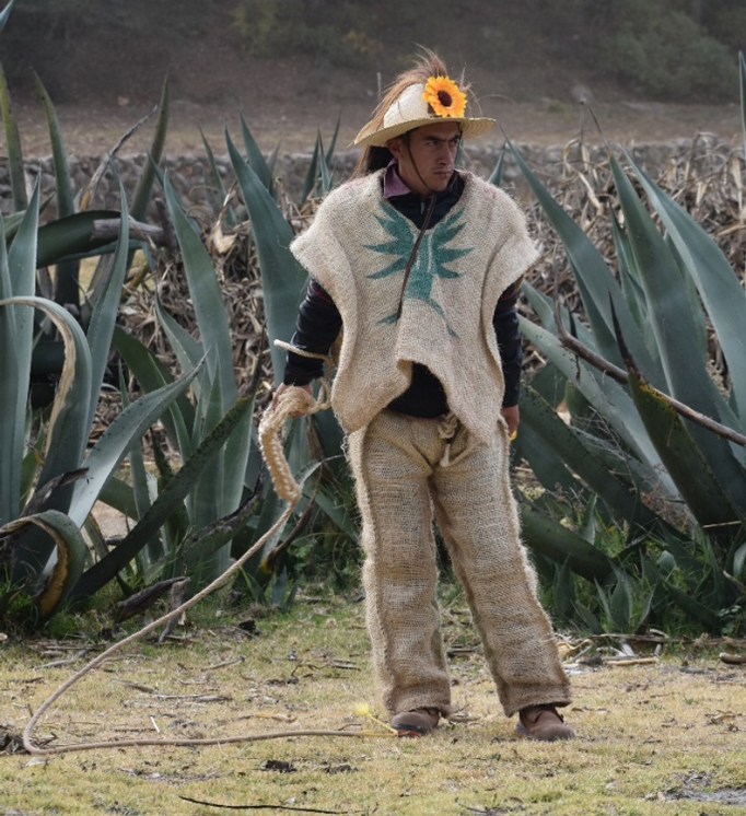 En el territorio reposa la identidad de una comunidad, pero en ocasiones encontramos distintas definiciones que no coinciden en sus límites y en su estructura espacial. La fiesta de los xhitas es reveladora en este sentido. Los xhitas son principalmente jóvenes oriundos de alguno de los dos barrios de Calpulalpan que se disfrazan diariamente durante 18 días con camisolas o ayates y pantalones fabricados a partir de costales de ixtle. En la cabeza portan un sombrero con flores artificiales y una gran cabellera de colas de res o caballo llamada xirguero, y en la mano sostienen un chicote en forma de látigo para imitar el ruido de los truenos (Figura 2). También llevan consigo una máscara que solo usan cuando entran en el patio de una casa a bailar y durante los tres días de procesiones. Su devoción o su compromiso con la colectividad los lleva a aceptar la responsabilidad, durante siete años seguidos, de participar en las festividades sin protestar y sin ausentarse de ninguno de los ritos; es lo que denominan su “manda”.