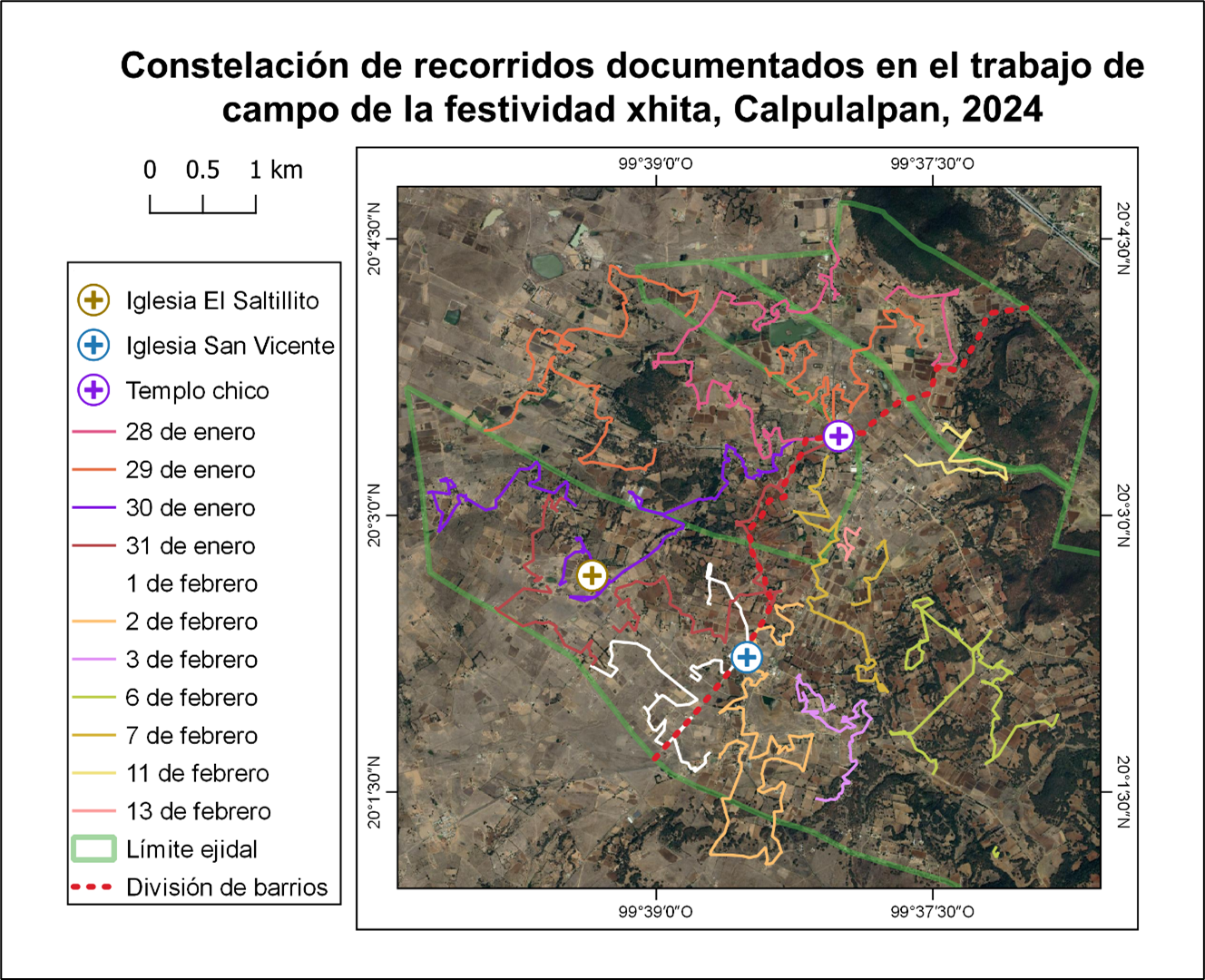 Las extenuantes jornadas comenzaron al alba, al repicar de las campanas, y terminaron más allá del ocaso. En cada hogar y en cada hito relevante del recorrido, se capturaron puntos con GPS. Así, se recopilaron centenas de ellos entre el 28 de enero y el 13 de febrero de 2024, que funcionaron como insumos vectoriales que, al final de la temporada, nos permitieron realizar los mapas que aquí se presentan. Siguiendo nuestra pregunta de investigación, buscamos evidenciar las diferencias espaciales entre los desplazamientos inicialmente imprevisibles de los xhitas y las ordenadas procesiones sancionadas por las autoridades religiosas, realizadas del jueves 8 al sábado 10 de febrero, intercaladas dentro de la propia festividad xhita.